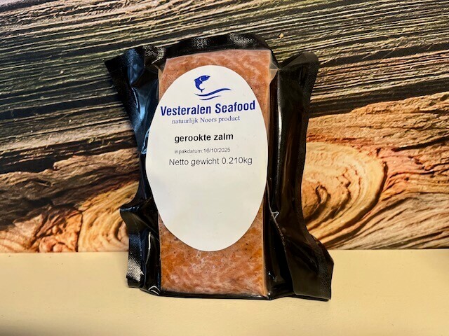 Diepgevroren gerookte zalm. Gewicht: 200g+/-5g.