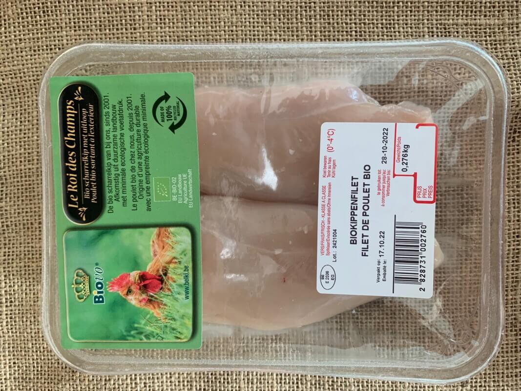 Belgisch biologisch kippenvlees. De verpakking bevat 2 kipfilets (diepgevroren). Ingevroren op de dag van slachten en daarna 3 maanden houdbaar. Totaal gewicht (2 stuks samen): ca. 466g (+/-8g).