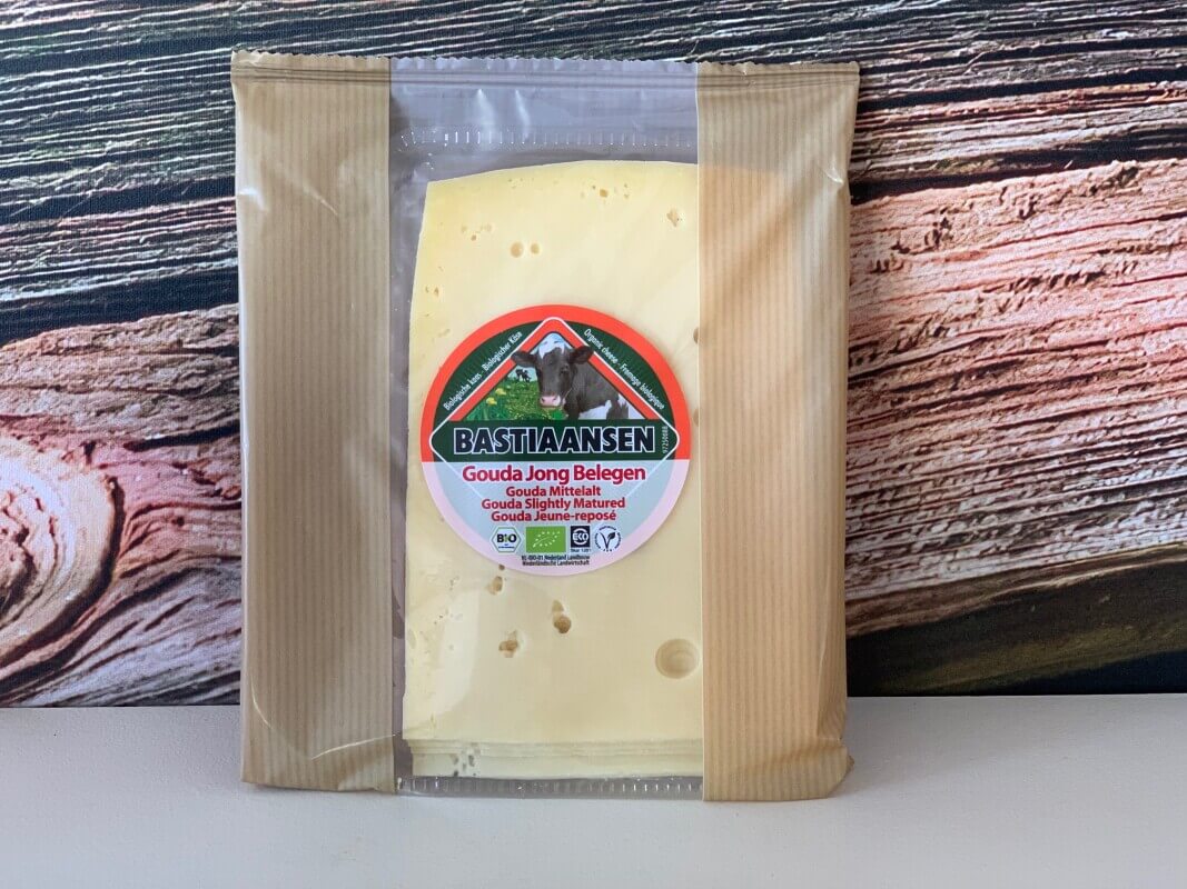 Biologische Nederlandse kaas 48+ met romige en licht pittige smaak. Ingrediënten: gepasteuriseerde biologische koeMELK, zout, zuursel, vegetarisch stremsel.